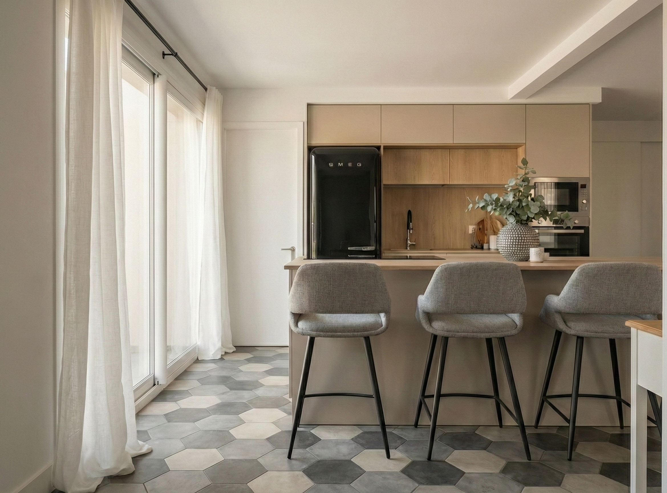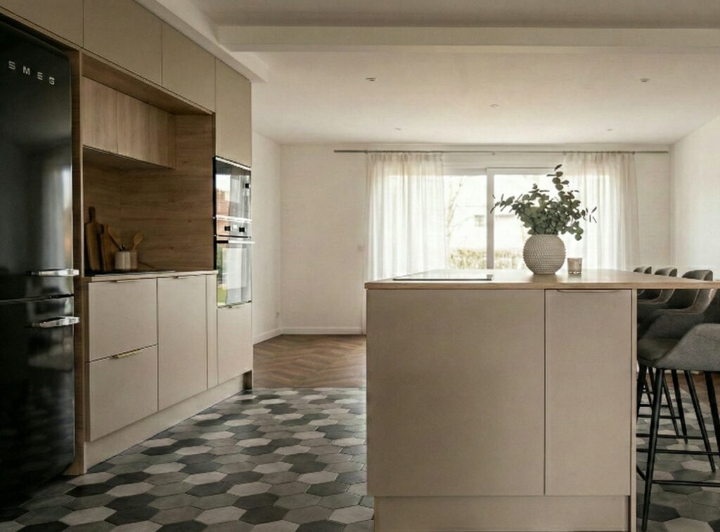 Transformation totale d’une cuisine devenue inadaptée en un espace fluide, lumineux et durable.