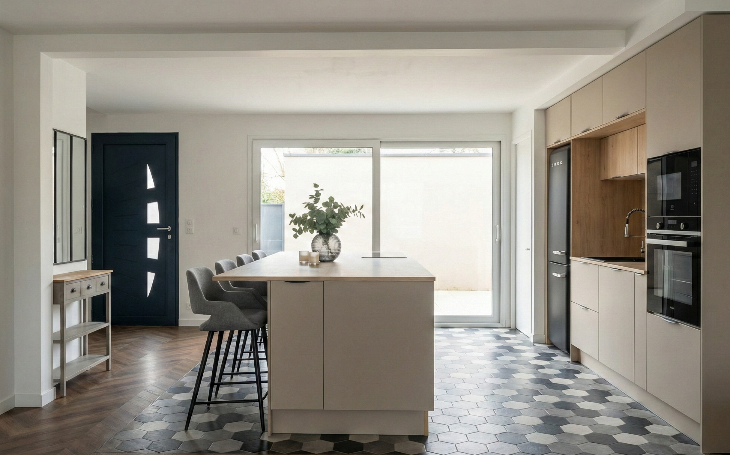 Dans cette maison des Sorinières, la cuisine ne répondait plus au mode de vie de cette famille active. L’agencement existant obstruait les passages, compliquait les déplacements au quotidien et manquait de cohérence avec leurs usages. Leur souhait était clair : retrouver une circulation fluide, des volumes plus lisibles et une cuisine agréable à vivre, pensée pour durer.