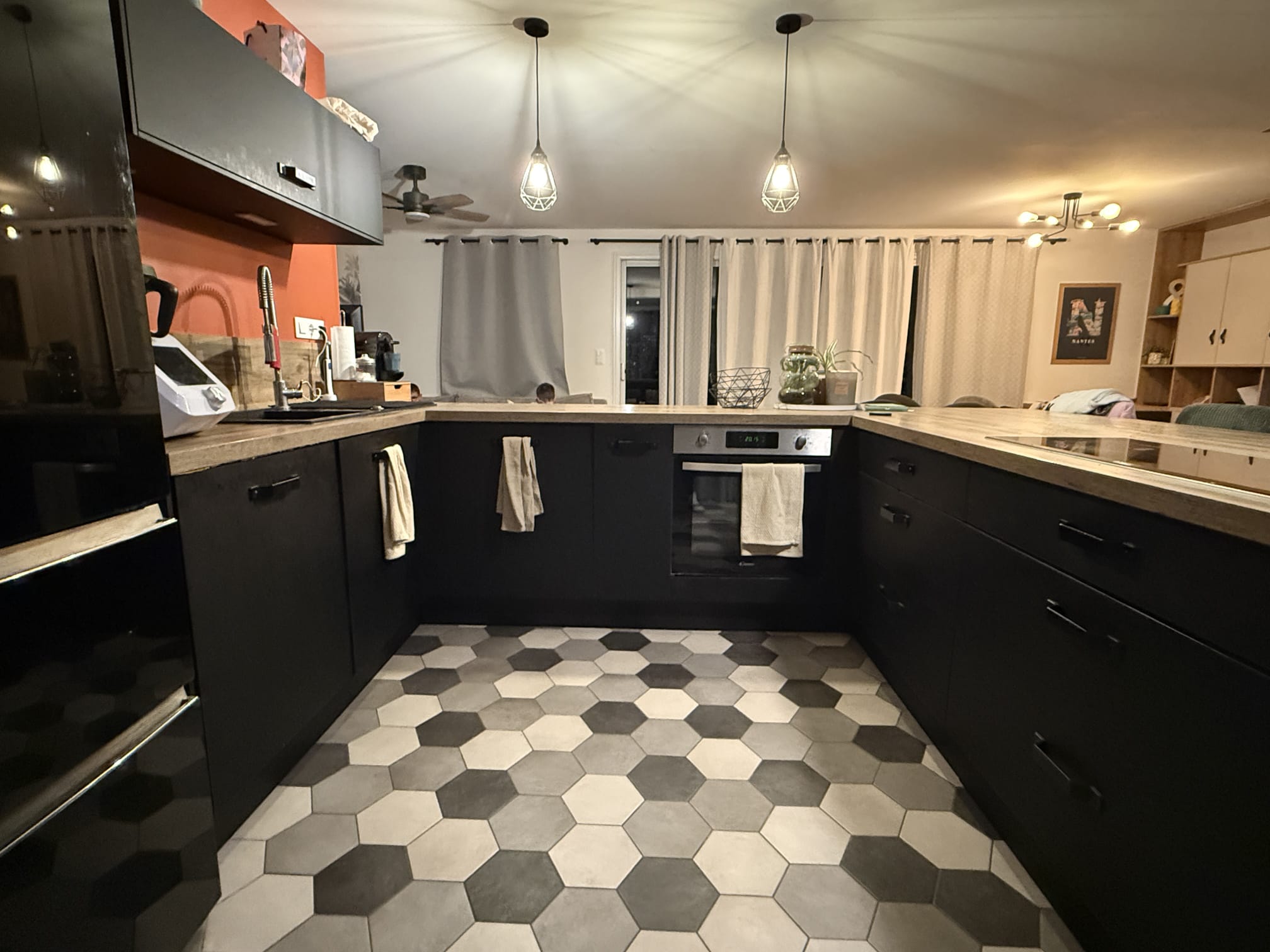 Fini le noir, jugé trop sombre et contraignant à l’entretien, place à une ambiance plus lumineuse et intemporelle. La cuisine en grande distribution, installée il y a seulement sept ans, montrait déjà ses limites : caissons fragilisés, charnières défaillantes, finitions qui ne résistaient pas à l’usage. Un constat qui a renforcé l’envie de concevoir un projet sur-mesure, qualitatif et pérenne.